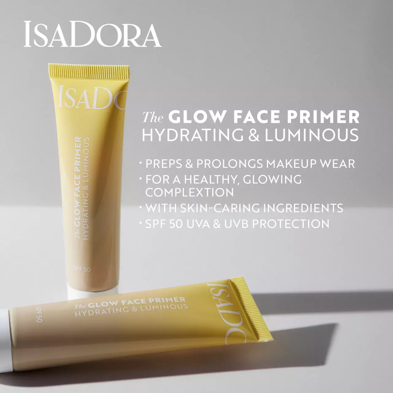 Glow Face Primer är en återfuktande och skyddande primer med SPF50 som kombinerar hudvård och makeup i en silkeslen, lystergivande formula. Den innehåller hyaluronsyra och probiotika som återfuktar och lugnar huden samtidigt som den jämnar ut och förlänger makeupens hållbarhet. Med skydd mot både UVA- och UVB-strålar. Cruelty free, vegansk och oparfymerad.
